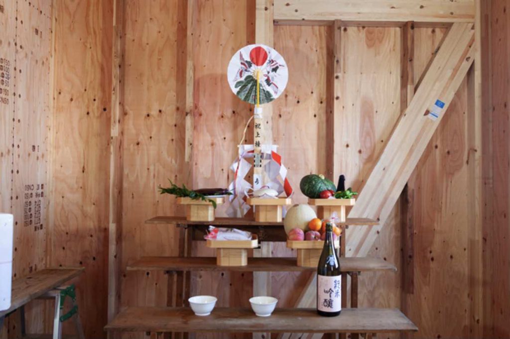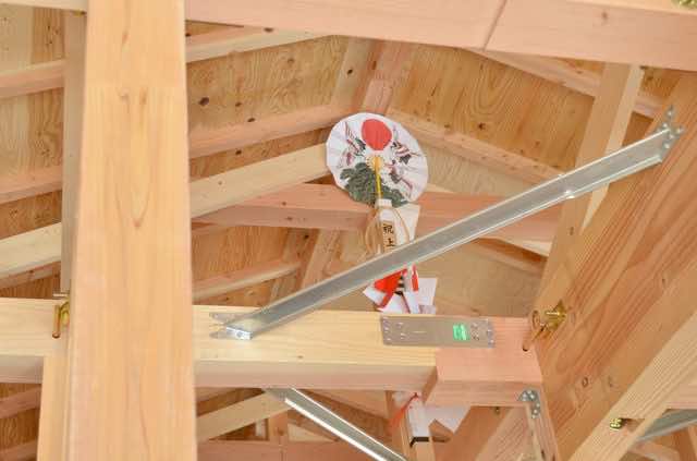 施主様皆さんと大工さんを中心とした関わる職人さんたちが一堂に会して挨拶やお礼をしたり、周りに人も巻き込むパターンだと屋根の上からお祝いのお餅やお菓子、小銭を投げ、通称餅撒きが執り行われたりします。