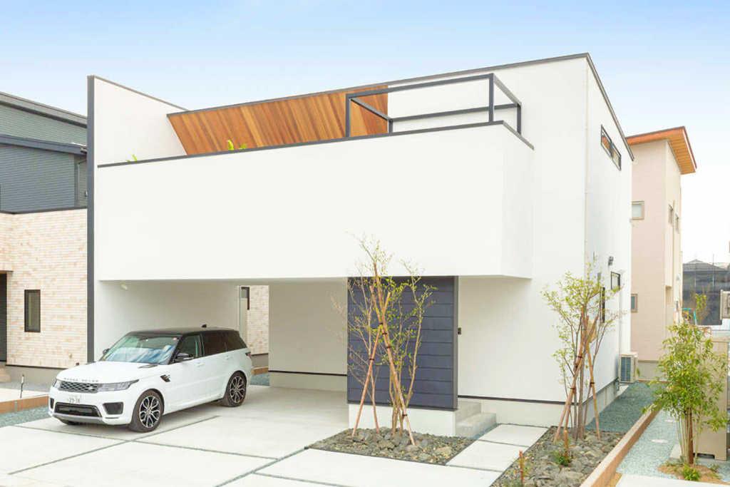 駐車スペースが2台確保できるガレージ付き住宅です。外からは見えないが、スカイテラススペースが開放的なのが特徴です。